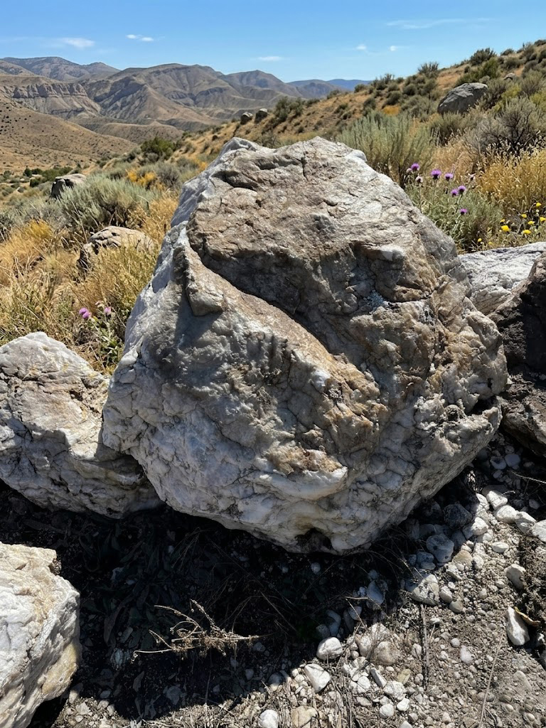 Цвет валунов: белый, при ближайшем рассмотрении видна кристаллическая структура кварца с небольшим количеством вкраплений.